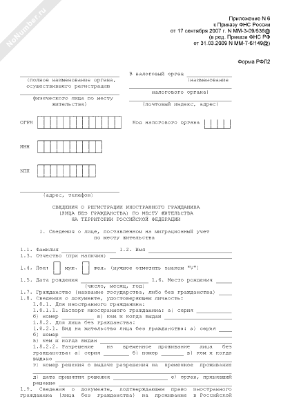 - 1660Сведения о регистрации иностранного гражданина (лица без гражданства) по месту жительства на территории Российской Федерации. Форма № РФЛ2