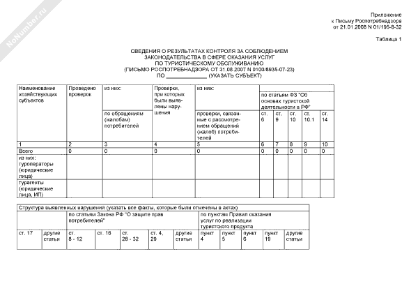 - 1683Сведения о результатах контроля за соблюдением законодательства в сфере оказания услуг по туристическому обслуживанию (письмо Роспотребнадзора от 31.08.2007 № 0100/8935-07-23)