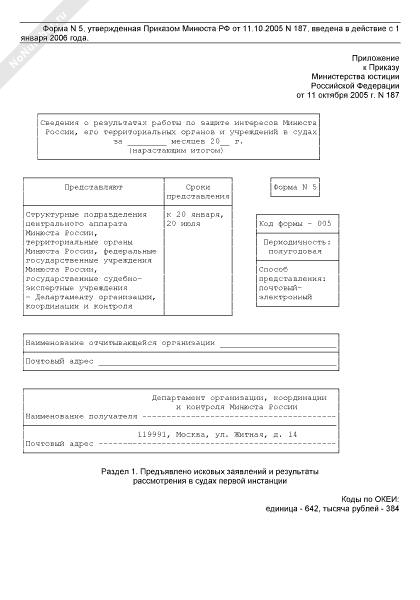 - 1689Сведения о результатах работы по защите интересов Минюста России, его территориальных органов и учреждений в судах (форма № 5)