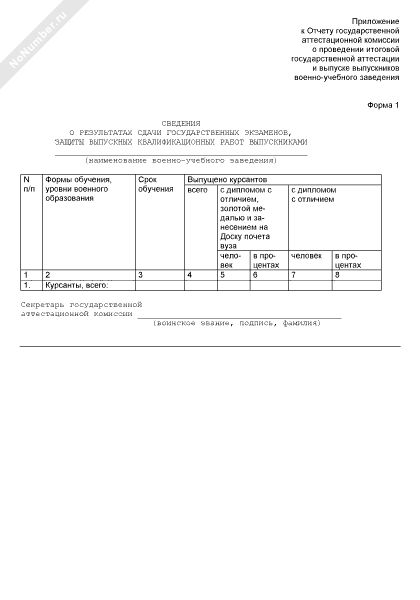 - 1691Сведения о результатах сдачи государственных экзаменов, защиты выпускных квалификационных работ выпускниками. Форма № 1 (приложение к отчету государственной аттестационной комиссии о проведении итоговой государственной аттестации и выпуске выпускников военных образовательных учреждений высшего профессионального образования внутренних войск Министерства внутренних дел Российской Федерации)