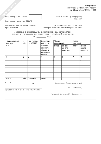 - 1716Сведения о репертуаре, исполненном на стационаре, выезде и гастролях на территории Российской Федерации. Форма № 9-НК (репертуар)