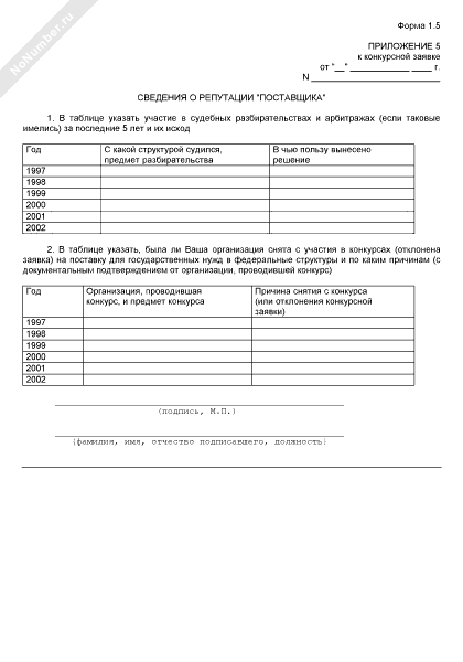 - 1718Сведения о репутации «Поставщика». Форма № 1.5 (приложение к конкурсной заявке)