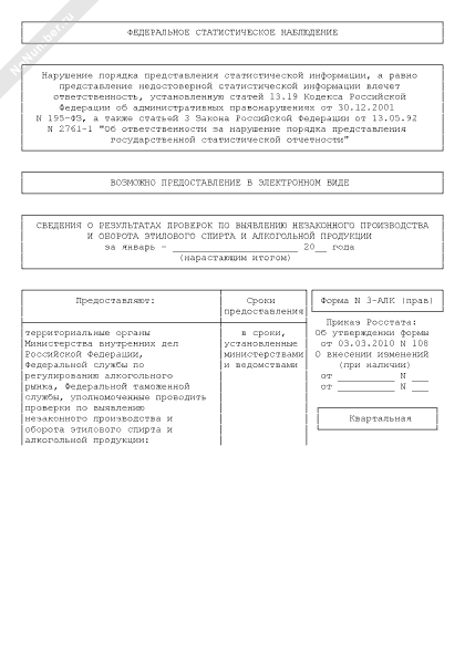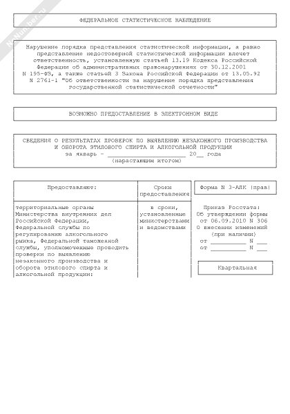 - 1710Сведения о результатах проверок по выявлению незаконного производства и оборота этилового спирта и алкогольной продукции. Форма № 3-АЛК (прав) (квартальная)