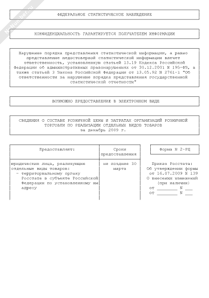 - 1843Сведения о составе розничной цены и затратах организаций розничной торговли по реализации отдельных видов товаров за декабрь 2009 г. Форма № 2-РЦ