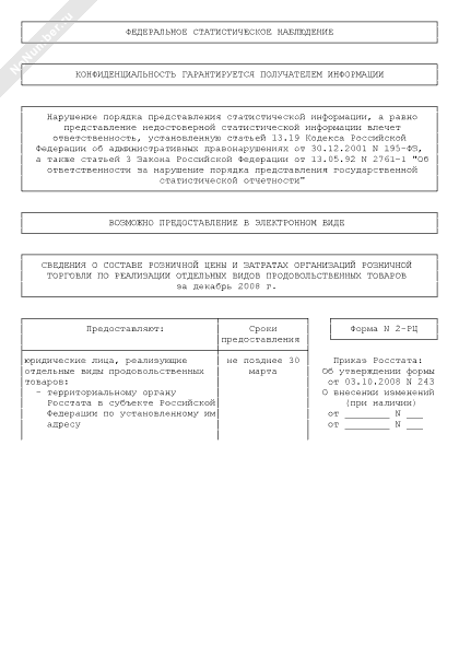 - 1841Сведения о составе розничной цены и затратах организаций розничной торговли по реализации отдельных видов продовольственных товаров за декабрь 2008 г. Форма № 2-РЦ (единовременная)