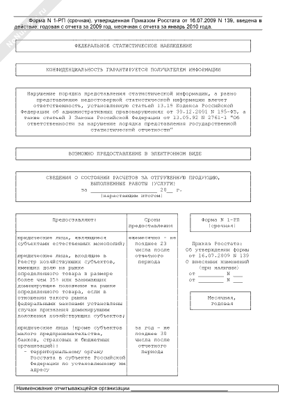 - 1842Сведения о состоянии расчетов за отгруженную продукцию, выполненные работы (услуги). Форма № 1-РП (срочная)