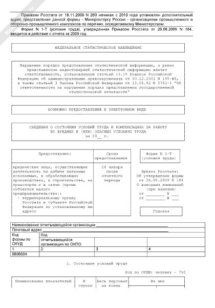 - 1846Сведения о состоянии условий труда и компенсациях за работу во вредных и (или) опасных условиях труда. Форма № 1-Т (условия труда) (годовая)
