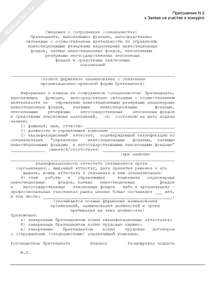 - 1851Сведения о сотрудниках (специалистах) претендента, выполняющих функции, непосредственно связанные с осуществлением деятельности по управлению инвестиционными резервами акционерных инвестиционных фондов, паевых инвестиционных фондов, пенсионными резервами негосударственных пенсионных фондов и средствами пенсионных накоплений (приложение к заявке на участие в конкурсе по отбору управляющих компаний для заключения с ними Пенсионным Фондом Российской Федерации договора доверительного управления средствами пенсионных накоплений)