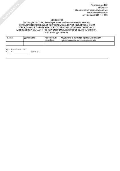 - 1859Сведения о специалистах, замещающих врача-инфекциониста, оказывающего медицинскую помощь ВИЧ-инфицированным гражданам в городских округах и муниципальных районах Московской области по территориальному принципу (участку), на период отпуска
