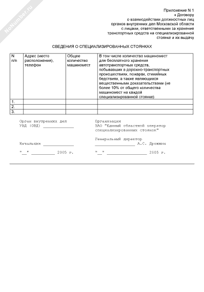 - 1860Сведения о специализированных стоянках (приложение к договору о взаимодействии должностных лиц органов внутренних дел Московской области с лицами, ответственными за хранение транспортных средств на специализированной стоянке и их выдачу)