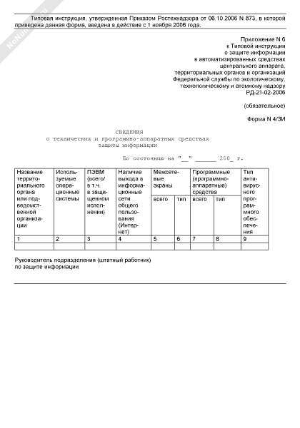 - 1956Сведения о технических и программно-аппаратных средствах защиты информации в автоматизированных средствах центрального аппарата, территориальных органов и организаций Федеральной службы по экологическому, технологическому и атомному надзору. Форма № 4/ЗИ (обязательная)