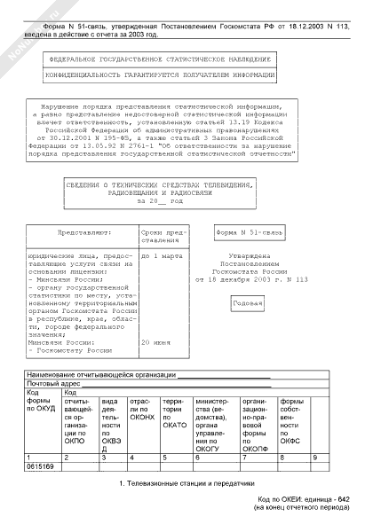 - 1955Сведения о технических средствах телевидения, радиовещания и радиосвязи. Форма № 51-связь