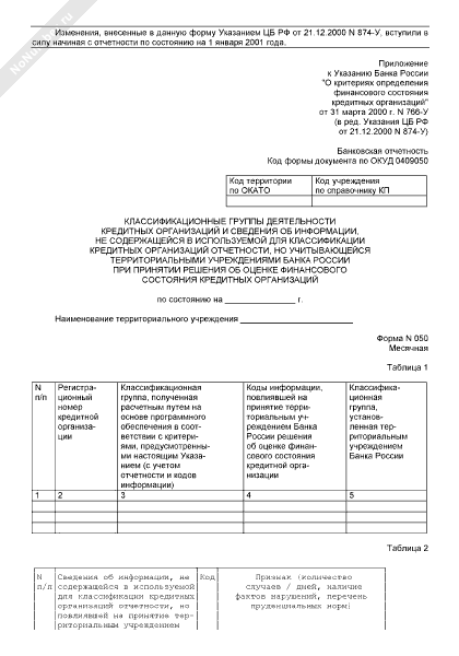 Классификационные группы деятельности кредитных организаций и сведения об информации, не содержащейся в используемой для классификации кредитных организаций отчетности, но учитывающейся территориальными учреждениями Банка России при принятии решения об оценке финансового состояния кредитных организаций. Форма № 050 (рекомендуемый образец заполнения)