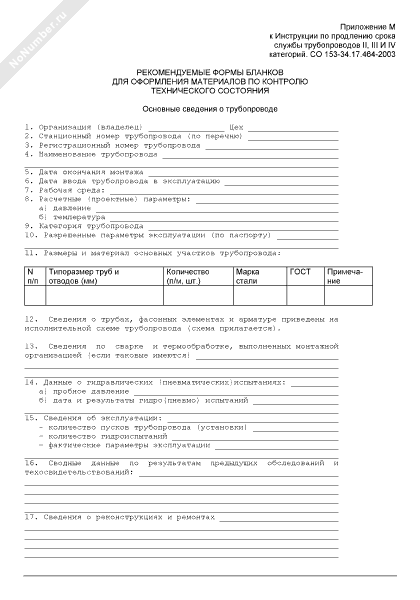 Рекомендуемые формы бланков для оформления материалов по контролю технического состояния трубопровода. Основные сведения о трубопроводе (рекомендуемый образец заполнения)