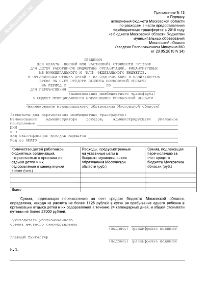 Сведения для оплаты (полной или частичной) стоимости путевок для детей работников бюджетных организаций, финансируемых из муниципального и (или) федерального бюджетов, в организации отдыха детей и их оздоровления в каникулярное время за счет средств бюджета Московской области для перечисления межбюджетного трансферта в бюджет муниципального образования Московской области
