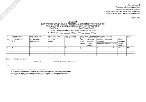 Сведения для уточнения данных о регистрации по месту жительства граждан Российской Федерации на территории города Москвы, изменивших фамилию, имя, отчество, пол. Форма № 11а (рекомендуемый образец заполнения)