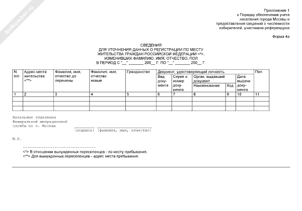 Сведения для уточнения данных о регистрации по месту жительства граждан Российской Федерации, изменивших фамилию, имя, отчество, пол. Форма № 4А (рекомендуемый образец заполнения)