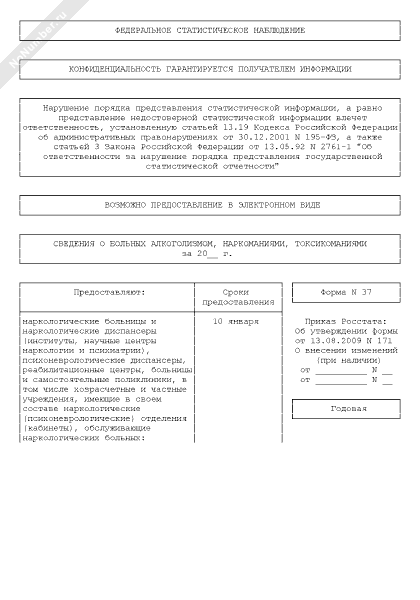 Сведения о больных алкоголизмом, наркоманиями, токсикоманиями. Форма № 37 (годовая)