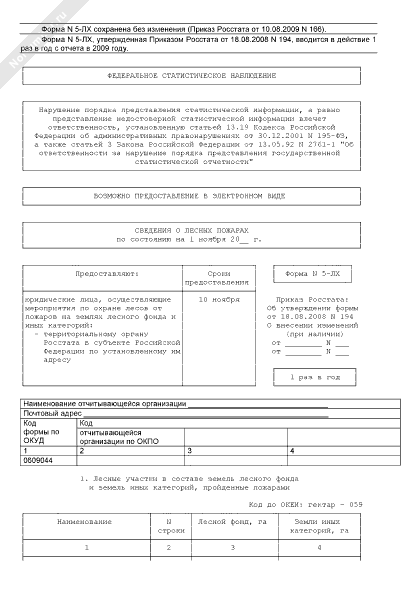 Сведения о лесных пожарах. Форма № 5-ЛХ (рекомендуемый образец заполнения)