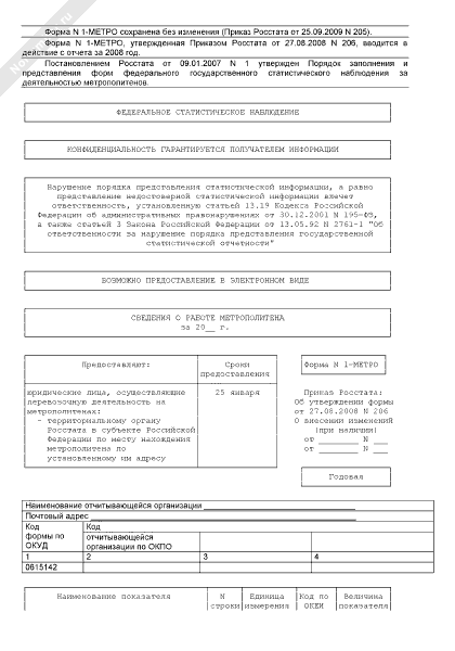 Сведения о работе метрополитена. Форма № 1-МЕТРО (годовая)