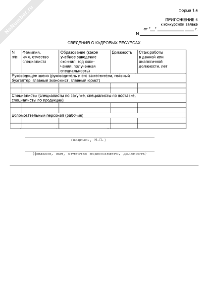 Сведения о кадровых ресурсах. Форма № 1.4 (приложение к конкурсной заявке)
