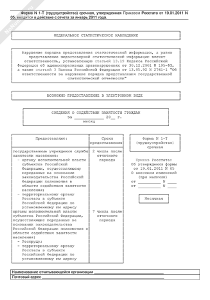 Сведения о содействии занятости граждан. Форма № 1-Т (трудоустройство) срочная (месячная)