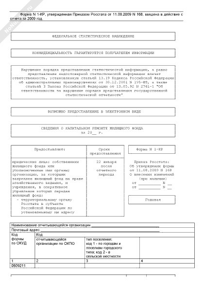 Сведения о капитальном ремонте жилищного фонда. Форма № 1-КР (годовая)