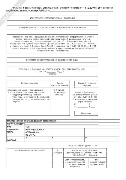 Сведения о тарифах на услуги связи для юридических лиц. Форма № 1-связь (тарифы) (месячная)