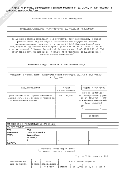 Сведения о технических средствах сетей телерадиовещания и радиосвязи. Форма № 50-связь (годовая)