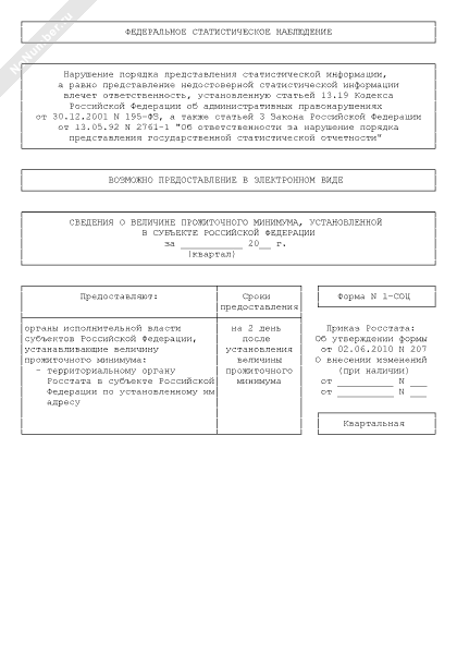 Сведения о величине прожиточного минимума, установленной в субъекте Российской Федерации. Форма № 1-СОЦ (квартальная)