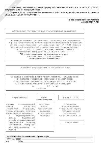 Сведения о величине прожиточного минимума. Форма № 1-СОЦ (квартальная)