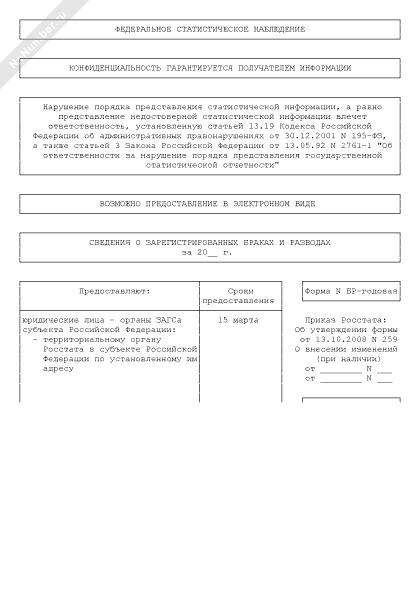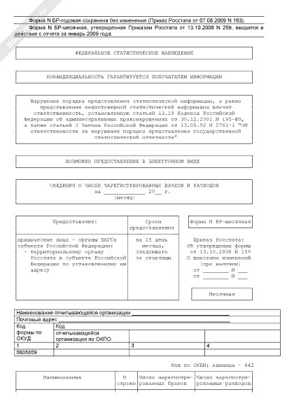 Сведения о зарегистрированных браках и разводах. Форма № БР-месячная