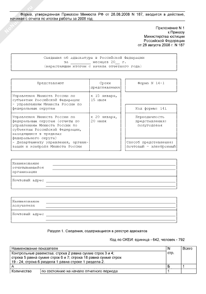 Сведения об адвокатуре в Российской Федерации. Форма № 14-1 (рекомендуемый образец заполнения)