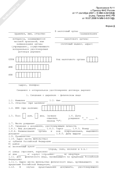 Сведения о нотариальном удостоверении договора дарения. Форма № Д