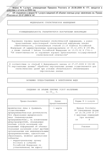 Сведения об объеме платных услуг населению. Форма № 1-услуги (годовая)