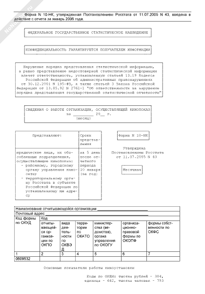 Сведения о работе организации, осуществляющей кинопоказ. Форма № 10-НК