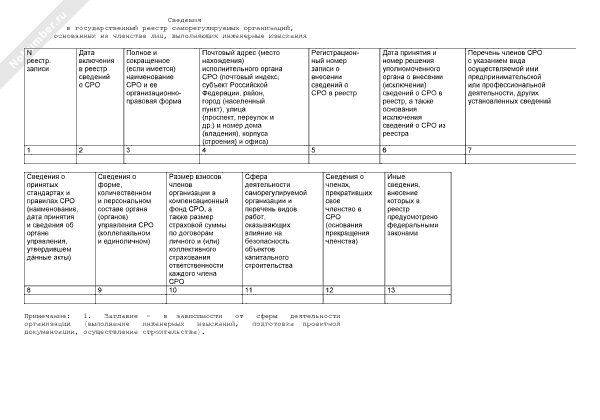 Сведения в государственный реестр саморегулируемых организаций, основанных на членстве лиц, выполняющих инженерные изыскания (приложение к заявлению о включении организации в государственный реестр саморегулируемых организаций (представляется на бумажном и электронном носителе))