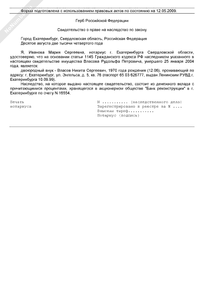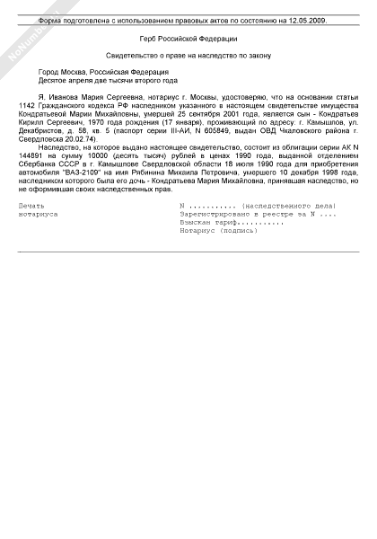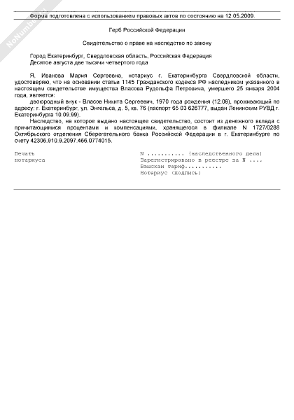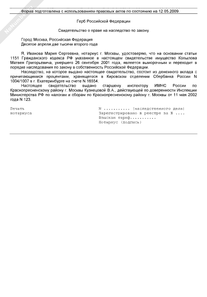- 345Свидетельство о праве на наследство по закону, выдаваемое одному наследнику (на денежный вклад в Сбербанке России)