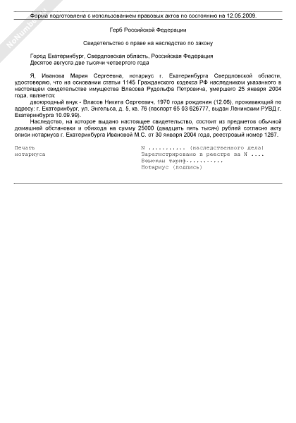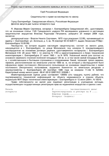 - 349Свидетельство о праве на наследство по закону, выдаваемое одному наследнику (на жилой дом)