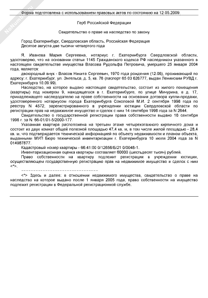 - 348Свидетельство о праве на наследство по закону, выдаваемое одному наследнику (на квартиру)