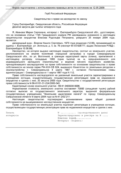 - 350Свидетельство о праве на наследство по закону, выдаваемое одному наследнику (на земельный участок)