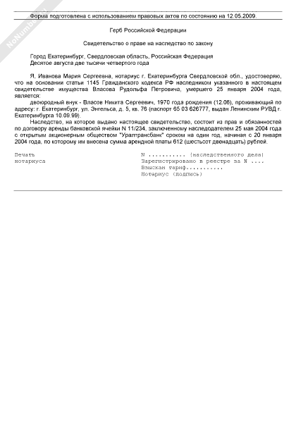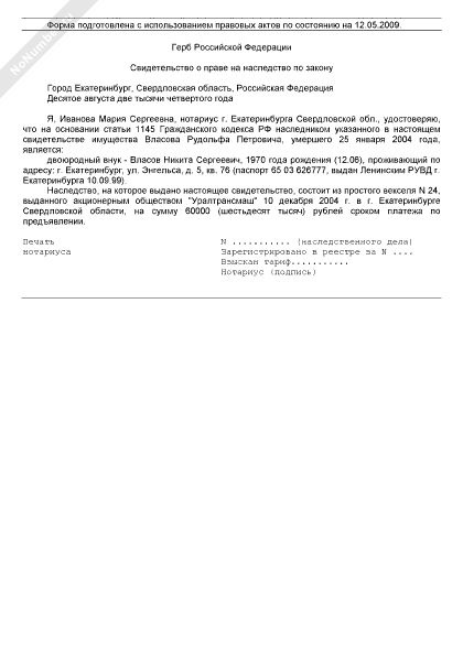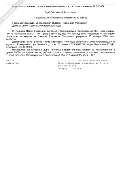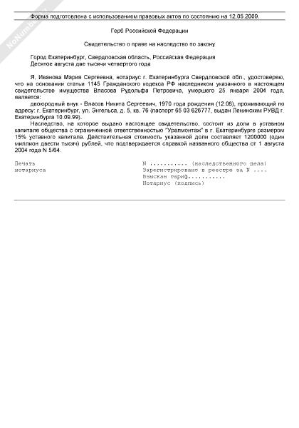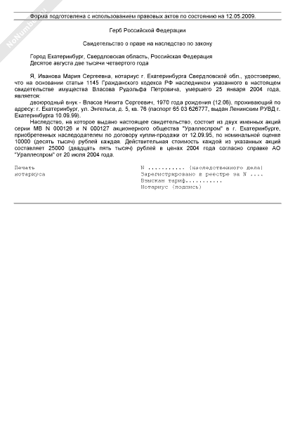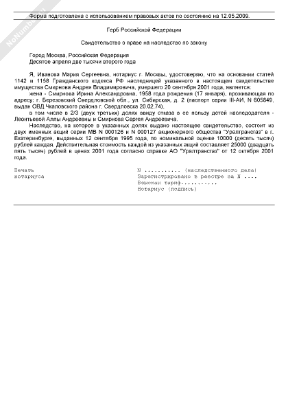 - 353Свидетельство о праве на наследство по закону, выдаваемое одному наследнику (на акции)
