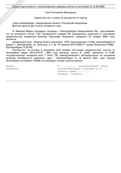- 352Свидетельство о праве на наследство по закону, выдаваемое одному наследнику (на автомобиль)