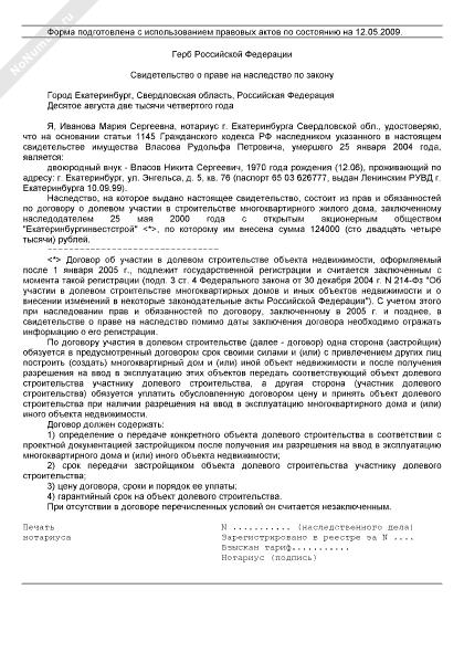 - 354Свидетельство о праве на наследство по закону, выдаваемое одному наследнику (на права и обязанности по договору участия в долевом строительстве)