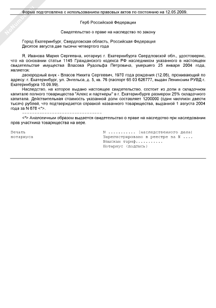 - 358Свидетельство о праве на наследство по закону, выдаваемое одному наследнику (на долю в складочном капитале полного товарищества)