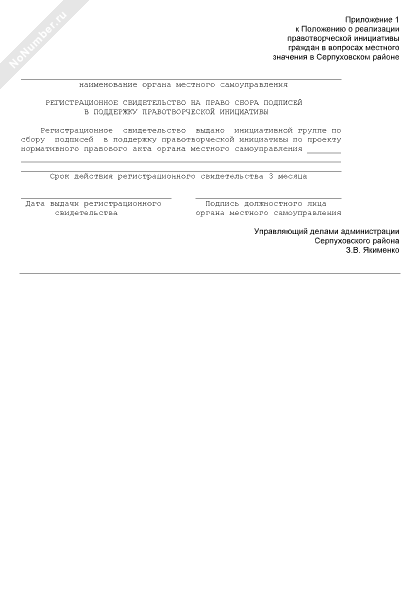 Регистрационное свидетельство на право сбора подписей в поддержку правотворческой инициативы в Серпуховском районе Московской области (рекомендуемый образец заполнения)