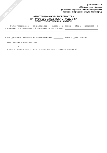 Регистрационное свидетельство на право сбора подписей в поддержку правотворческой инициативы граждан в городском округе Звенигород Московской области (рекомендуемый образец заполнения)