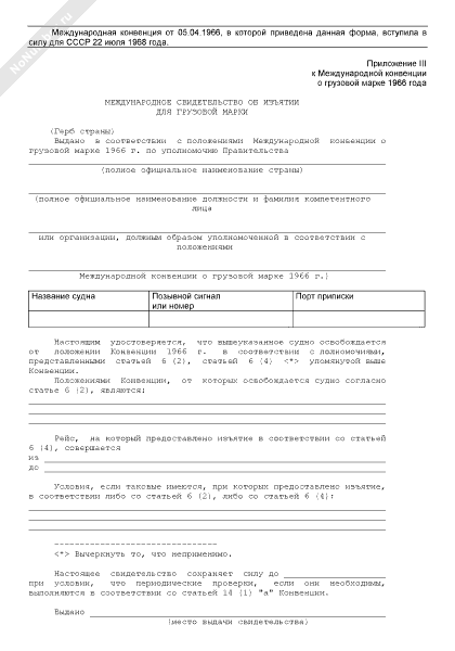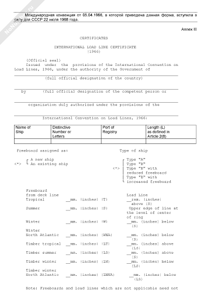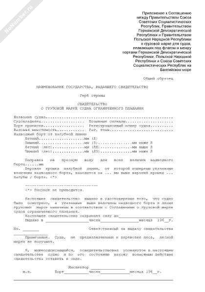 Свидетельство о грузовой марке судна ограниченного плавания (для судов, плавающих под флагом и между портами Германской Демократической Республики, Польской Народной Республики и Союза Советских Социалистических Республик на Балтийском море)