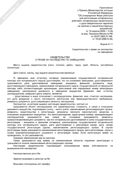 Свидетельство о праве на наследство по завещанию (форма № 11)