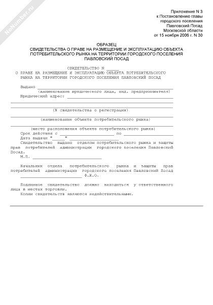 Свидетельство о праве на размещение и эксплуатацию объекта потребительского рынка на территории городского поселения Павловский Посад Павлово-Посадского муниципального района Московской области (рекомендуемый образец заполнения)